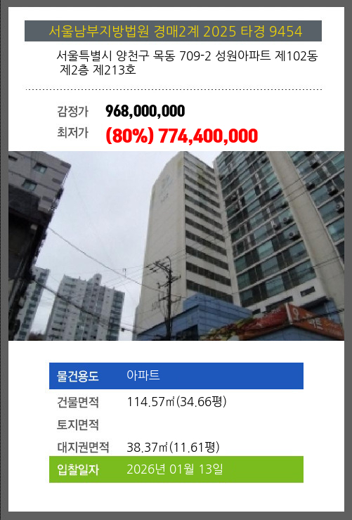 사건번호 2025 타경 9454 본건은 서울특별시 양천구 목동 709-2 성원아파트 제102동 제2층 제213호소재하는 아파트경매 물건의 포스팅입니다. 건물면적 [ 114.57㎡ (34.66평) ]대지권 [ 38.37㎡ (11.61평) ]