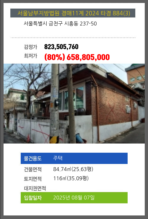 사건번호 2024 타경 884(3) 본건은 서울특별시 금천구 시흥동 237-50소재하는 주택경매 물건의 포스팅입니다. 건물면적 [ 84.74㎡ (25.63평) ]토지면적 [ 116㎡ (35.09평) ] 시세를 반영한 감정가 823,505,760에서1회