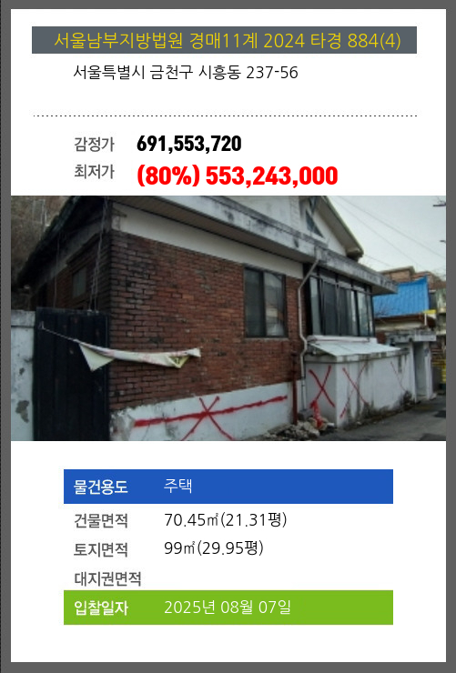 사건번호 2024 타경 884(4) 본건은 서울특별시 금천구 시흥동 237-56소재하는 주택경매 물건의 포스팅입니다. 건물면적 [ 70.45㎡ (21.31평) ]토지면적 [ 99㎡ (29.95평) ] 시세를 반영한 감정가 691,553,720에서1회