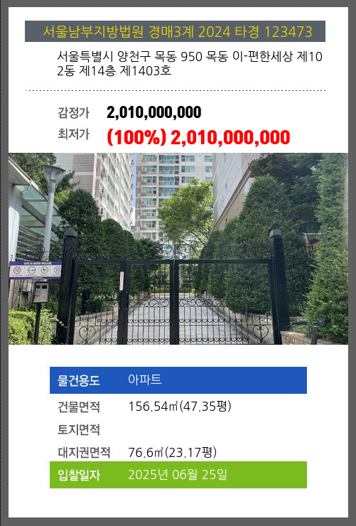 사건번호 2024 타경 123473 본건은 서울특별시 양천구 목동 950 목동 이-편한세상 제102동 제14층 제1403호소재하는 아파트경매 물건의 포스팅입니다. 건물면적 [ 156.54㎡ (47.35평) ]대지권 [ 76.6㎡ (23.17평)