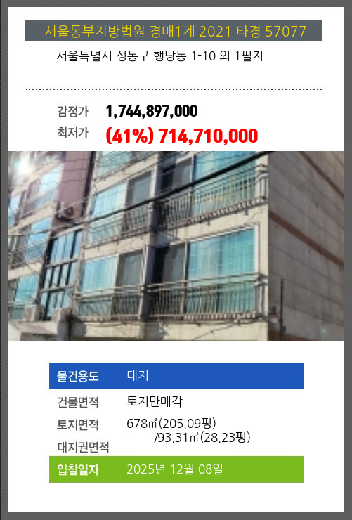 사건번호 2021 타경 57077 본건은 서울특별시 성동구 행당동 1-10 외 1필지소재하는 대지경매 물건의 포스팅입니다. 건물면적 [ 토지만매각 ]토지면적 [ 전체:678㎡ (205.09평) 매각지분:93.31㎡ (28.23평) ] 시세를
