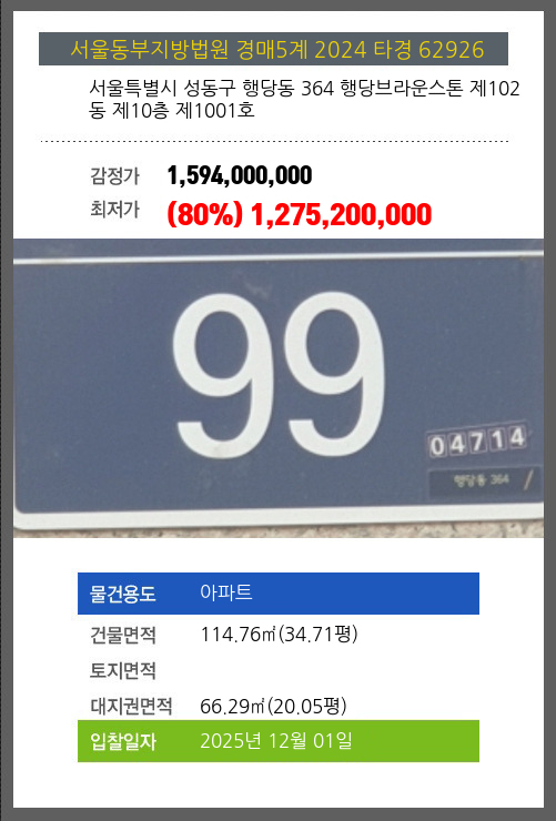 사건번호 2024 타경 62926 본건은 서울특별시 성동구 행당동 364 행당브라운스톤 제102동 제10층 제1001호소재하는 아파트경매 물건의 포스팅입니다. 건물면적 [ 114.76㎡ (34.71평) ]대지권 [ 66.29㎡ (20.05평) ]