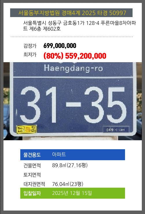 사건번호 2025 타경 50997 본건은 서울특별시 성동구 금호동1가 128-4 푸른마을8차아파트 제6층 제602호소재하는 아파트경매 물건의 포스팅입니다. 건물면적 [ 89.8㎡ (27.16평) ]대지권 [ 76.04㎡ (23평) ] 시세를