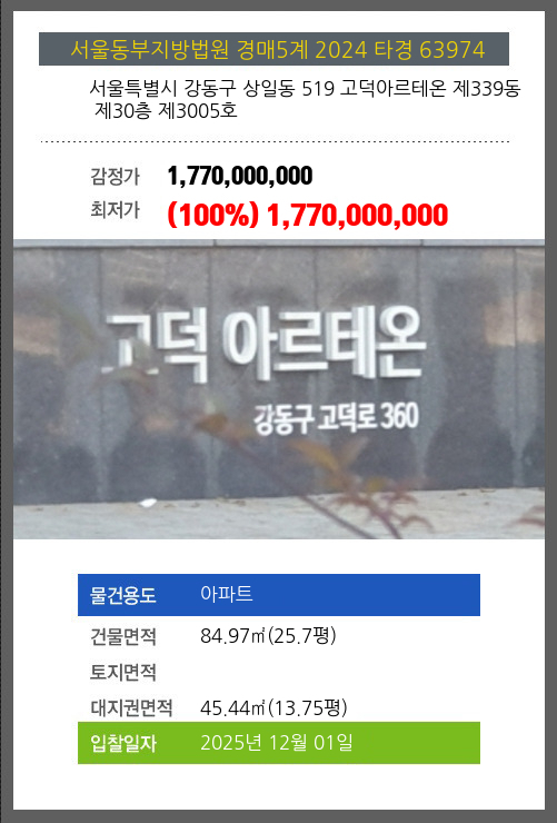 사건번호 2024 타경 63974 본건은 서울특별시 강동구 상일동 519 고덕아르테온 제339동 제30층 제3005호소재하는 아파트경매 물건의 포스팅입니다. 건물면적 [ 84.97㎡ (25.7평) ]대지권 [ 45.44㎡ (13.75평) ]