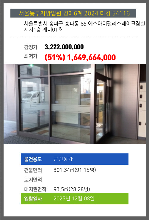 사건번호 2024 타경 54116 본건은 서울특별시 송파구 송파동 85 에스아이팰리스레이크잠실 제지1층 제비01호소재하는 근린상가경매 물건의 포스팅입니다. 건물면적 [ 301.34㎡ (91.15평) ]대지권 [ 93.5㎡ (28.28평) ] 시세를