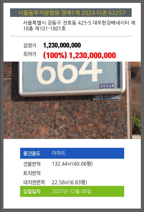 사건번호 2024 타경 63257 본건은 서울특별시 강동구 천호동 425-5 대우한강베네시티 제18층 제101-1801호소재하는 아파트경매 물건의 포스팅입니다. 건물면적 [ 132.44㎡ (40.06평) ]대지권 [ 22.58㎡ (6.83평) ] 시세를