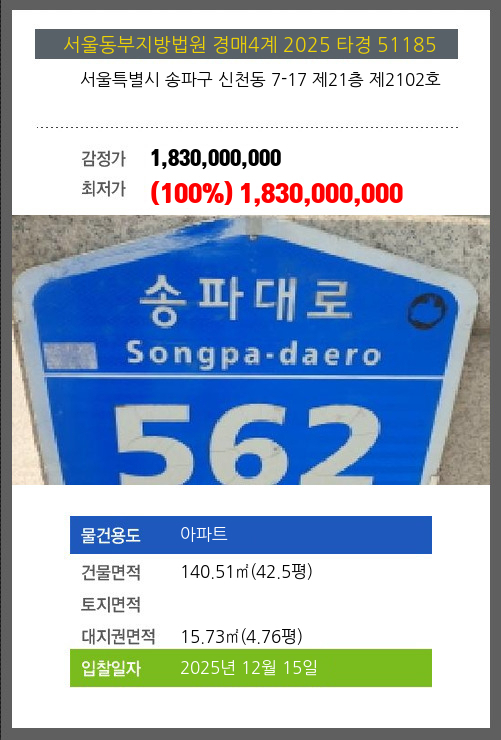 사건번호 2025 타경 51185 본건은 서울특별시 송파구 신천동 7-17 제21층 제2102호소재하는 아파트경매 물건의 포스팅입니다. 건물면적 [ 140.51㎡ (42.5평) ]대지권 [ 15.73㎡ (4.76평) ] 시세를 반영한