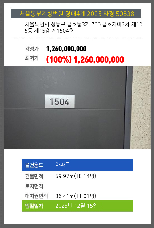 사건번호 2025 타경 50838 본건은 서울특별시 성동구 금호동3가 700 금호자이2차 제105동 제15층 제1504호소재하는 아파트경매 물건의 포스팅입니다. 건물면적 [ 59.97㎡ (18.14평) ]대지권 [ 36.41㎡ (11.01평) ]