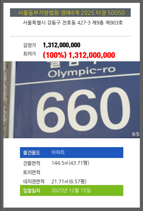 사건번호 2025 타경 50050 본건은 서울특별시 강동구 천호동 427-3 제9층 제903호소재하는 아파트경매 물건의 포스팅입니다. 건물면적 [ 144.5㎡ (43.71평) ]대지권 [ 21.71㎡ (6.57평) ] 시세를 반영한