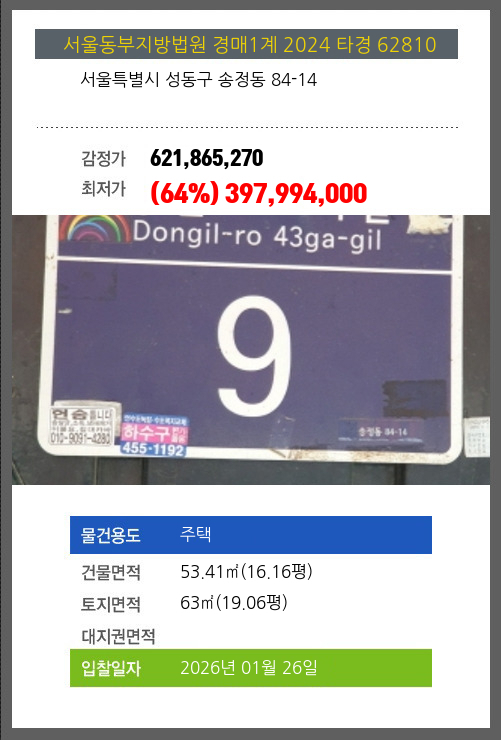 사건번호 2024 타경 62810 본건은 서울특별시 성동구 송정동 84-14소재하는 주택경매 물건의 포스팅입니다. 건물면적 [ 53.41㎡ (16.16평) ]토지면적 [ 63㎡ (19.06평) ] 시세를 반영한 감정가 621,865,270에서2회