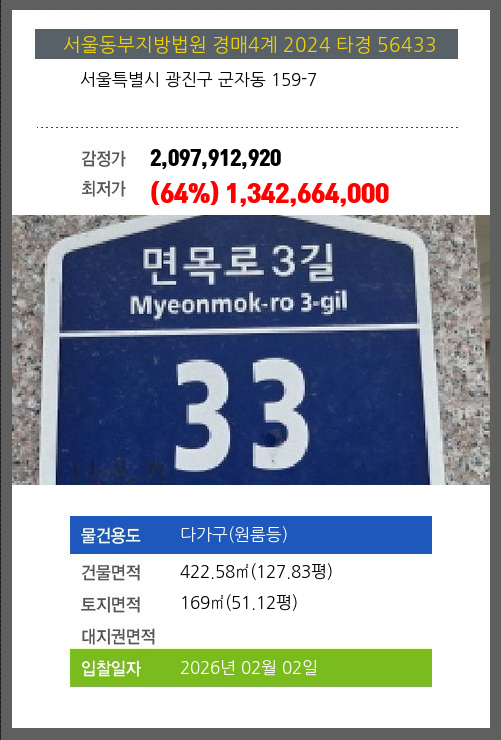 사건번호 2024 타경 56433 본건은 서울특별시 광진구 군자동 159-7소재하는 다가구(원룸등)경매 물건의 포스팅입니다. 건물면적 [ 422.58㎡ (127.83평) ]토지면적 [ 169㎡ (51.12평) ] 시세를 반영한 감정가 2,097,912,920에서2회