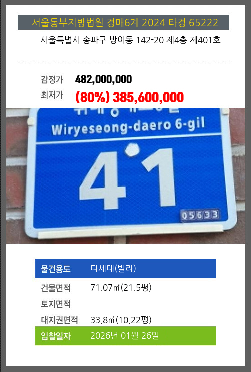 사건번호 2024 타경 65222 본건은 서울특별시 송파구 방이동 142-20 제4층 제401호소재하는 다세대(빌라)경매 물건의 포스팅입니다. 건물면적 [ 71.07㎡ (21.5평) ]대지권 [ 33.8㎡ (10.22평) ] 시세를 반영한