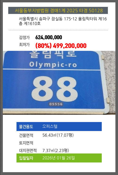 사건번호 2025 타경 50128 본건은 서울특별시 송파구 잠실동 175-12 올림픽타워 제16층 제1610호소재하는 오피스텔경매 물건의 포스팅입니다. 건물면적 [ 56.43㎡ (17.07평) ]대지권 [ 7.37㎡ (2.23평) ] 시세를