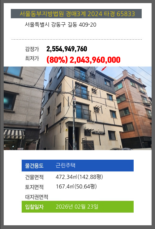 사건번호 2024 타경 65833 본건은 서울특별시 강동구 길동 409-20소재하는 근린주택경매 물건의 포스팅입니다. 건물면적 [ 472.34㎡ (142.88평) ]토지면적 [ 167.4㎡ (50.64평) ] 시세를 반영한 감정가 2,554,949,760에서1회