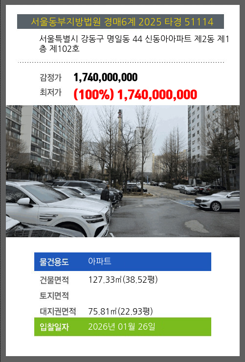 사건번호 2025 타경 51114 본건은 서울특별시 강동구 명일동 44 신동아아파트 제2동 제1층 제102호소재하는 아파트경매 물건의 포스팅입니다. 건물면적 [ 127.33㎡ (38.52평) ]대지권 [ 75.81㎡ (22.93평) ]