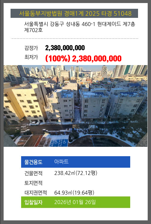 사건번호 2025 타경 51048 본건은 서울특별시 강동구 성내동 460-1 현대제이드 제7층 제702호소재하는 아파트경매 물건의 포스팅입니다. 건물면적 [ 238.42㎡ (72.12평) ]대지권 [ 64.93㎡ (19.64평) ] 시세를