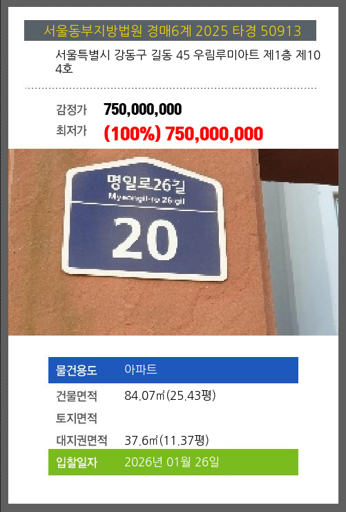 사건번호 2025 타경 50913 본건은 서울특별시 강동구 길동 45 우림루미아트 제1층 제104호소재하는 아파트경매 물건의 포스팅입니다. 건물면적 [ 84.07㎡ (25.43평) ]대지권 [ 37.6㎡ (11.37평) ] 시세를
