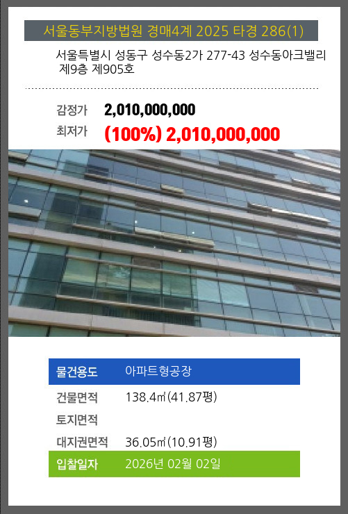 사건번호 2025 타경 286(1) 본건은 서울특별시 성동구 성수동2가 277-43 성수동아크밸리 제9층 제905호소재하는 아파트형공장경매 물건의 포스팅입니다. 건물면적 [ 138.4㎡ (41.87평) ]대지권 [ 36.05㎡ (10.91평) ] 시세를