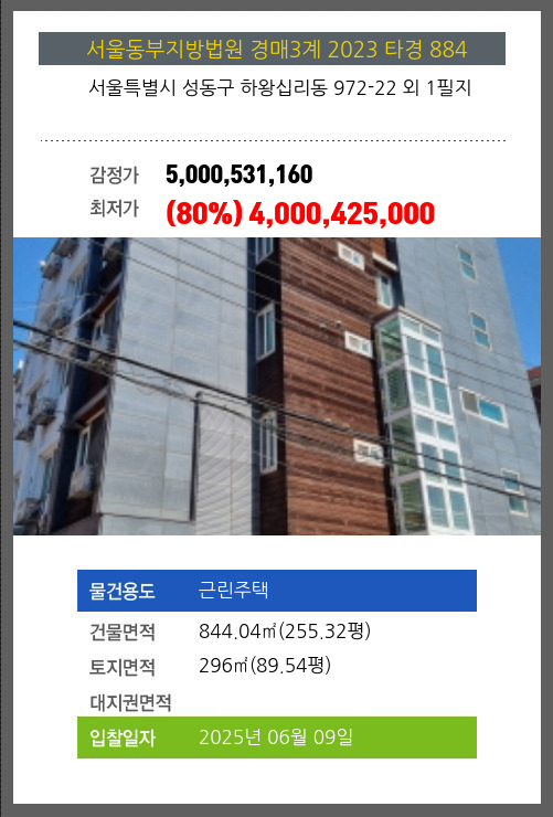 사건번호 2023 타경 884 본건은 서울특별시 성동구 하왕십리동 972-22 외 1필지소재하는 근린주택경매 물건의 포스팅입니다. 건물면적 [ 844.04㎡ (255.32평) ]토지면적 [ 296㎡ (89.54평) ] 시세를 반영한