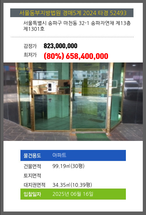 사건번호 2024 타경 52493 본건은 서울특별시 송파구 마천동 32-1 송파자연채 제13층 제1301호소재하는 아파트경매 물건의 포스팅입니다. 건물면적 [ 99.19㎡ (30평) ]대지권 [ 34.35㎡ (10.39평) ] 시세를