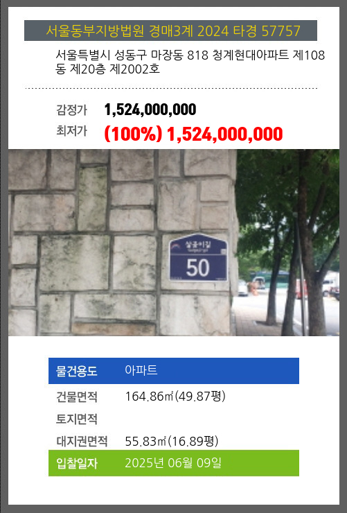 사건번호 2024 타경 57757 본건은 서울특별시 성동구 마장동 818 청계현대아파트 제108동 제20층 제2002호소재하는 아파트경매 물건의 포스팅입니다. 건물면적 [ 164.86㎡ (49.87평) ]대지권 [ 55.83㎡ (16.89평) ]