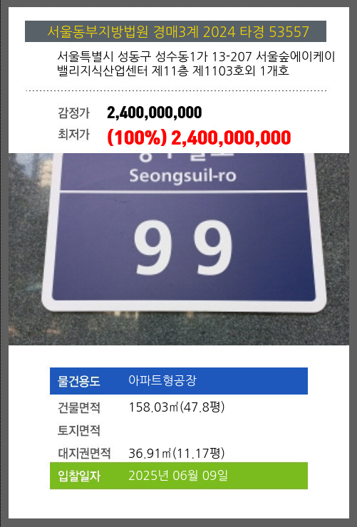 사건번호 2024 타경 53557 본건은 서울특별시 성동구 성수동1가 13-207 서울숲에이케이밸리지식산업센터 제11층 제1103호외 1개호소재하는 아파트형공장경매 물건의 포스팅입니다. 건물면적 [ 158.03㎡ (47.8평) ]대지권 [ 36.91㎡ (11.17평) ]