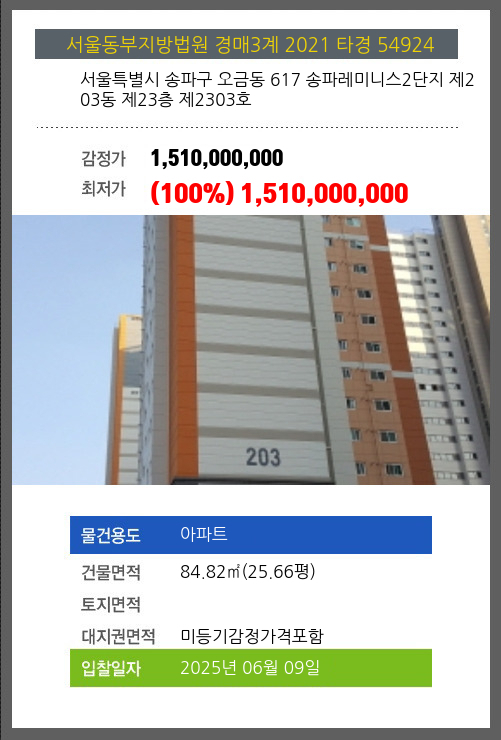 사건번호 2021 타경 54924 본건은 서울특별시 송파구 오금동 617 송파레미니스2단지 제203동 제23층 제2303호소재하는 아파트경매 물건의 포스팅입니다. 건물면적 [ 84.82㎡ (25.66평) ]대지권 [ 미등기감정가격포함 ] 시세를