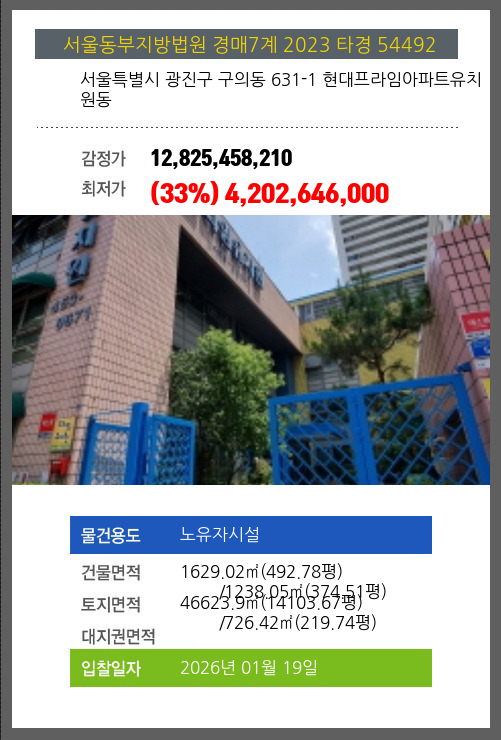 사건번호 2023 타경 54492 본건은 서울특별시 광진구 구의동 631-1 현대프라임아파트유치원동소재하는 노유자시설경매 물건의 포스팅입니다. 건물면적 [ 전체:1629.02㎡ (492.78평) 매각지분:1238.05㎡ (374.51평) ]토지면적 [ 전체:46623.9㎡ (14103.67평) 매각지분:726.42㎡ (219.74평)