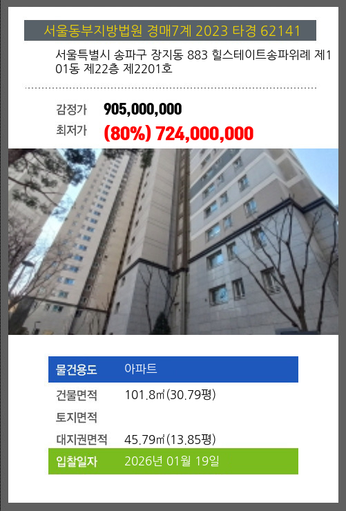 사건번호 2023 타경 62141 본건은 서울특별시 송파구 장지동 883 힐스테이트송파위례 제101동 제22층 제2201호소재하는 아파트경매 물건의 포스팅입니다. 건물면적 [ 101.8㎡ (30.79평) ]대지권 [ 45.79㎡ (13.85평) ]
