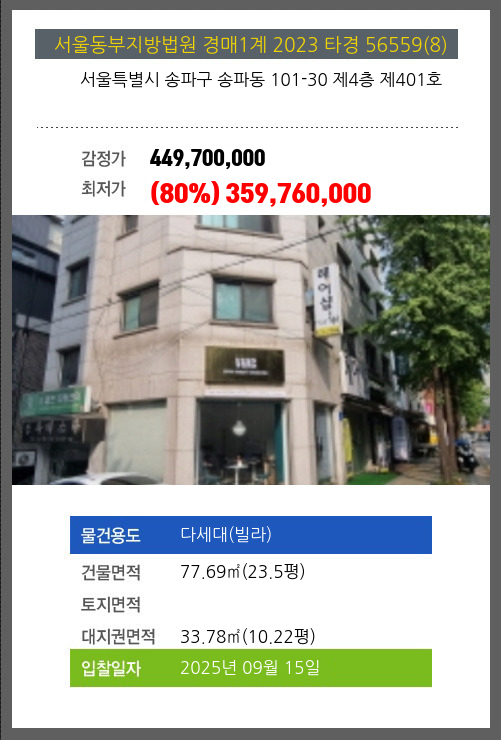사건번호 2023 타경 56559(8) 본건은 서울특별시 송파구 송파동 101-30 제4층 제401호소재하는 다세대(빌라)경매 물건의 포스팅입니다. 건물면적 [ 77.69㎡ (23.5평) ]대지권 [ 33.78㎡ (10.22평) ] 시세를 반영한