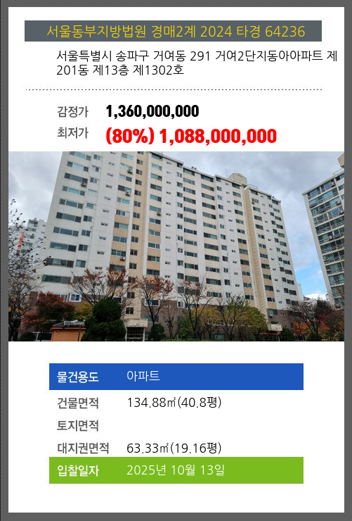사건번호 2024 타경 64236 본건은 서울특별시 송파구 거여동 291 거여2단지동아아파트 제201동 제13층 제1302호소재하는 아파트경매 물건의 포스팅입니다. 건물면적 [ 134.88㎡ (40.8평) ]대지권 [ 63.33㎡ (19.16평) ]