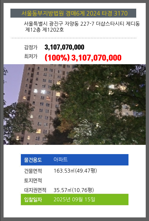 사건번호 2024 타경 3170 본건은 서울특별시 광진구 자양동 227-7 더샵스타시티 제디동 제12층 제1202호소재하는 아파트경매 물건의 포스팅입니다. 건물면적 [ 163.53㎡ (49.47평) ]대지권 [ 35.57㎡ (10.76평) ]