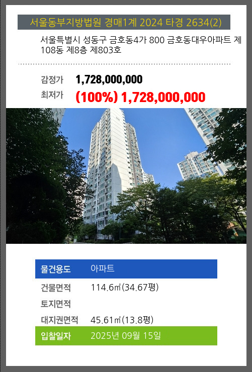 사건번호 2024 타경 2634(2) 본건은 서울특별시 성동구 금호동4가 800 금호동대우아파트 제108동 제8층 제803호소재하는 아파트경매 물건의 포스팅입니다. 건물면적 [ 114.6㎡ (34.67평) ]대지권 [ 45.61㎡ (13.8평) ]