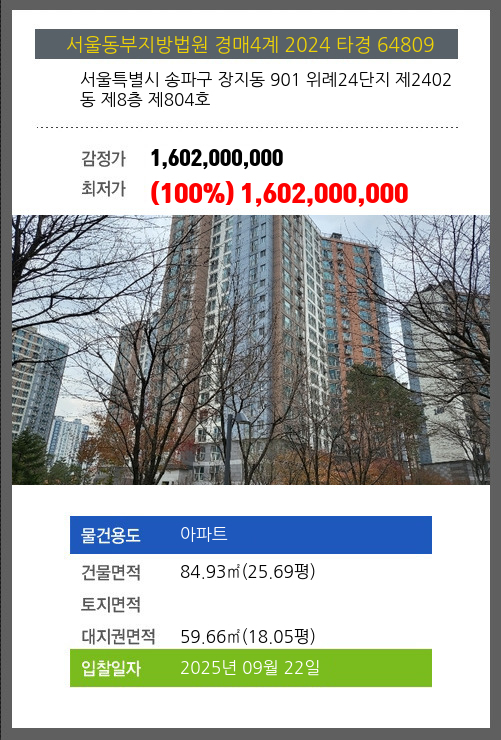 사건번호 2024 타경 64809 본건은 서울특별시 송파구 장지동 901 위례24단지 제2402동 제8층 제804호소재하는 아파트경매 물건의 포스팅입니다. 건물면적 [ 84.93㎡ (25.69평) ]대지권 [ 59.66㎡ (18.05평) ]