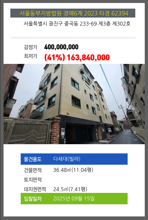 사건번호 2023 타경 62394 본건은 서울특별시 광진구 중곡동 233-69 제3층 제302호소재하는 다세대(빌라)경매 물건의 포스팅입니다. 건물면적 [ 36.48㎡ (11.04평) ]대지권 [ 24.5㎡ (7.41평) ] 시세를 반영한