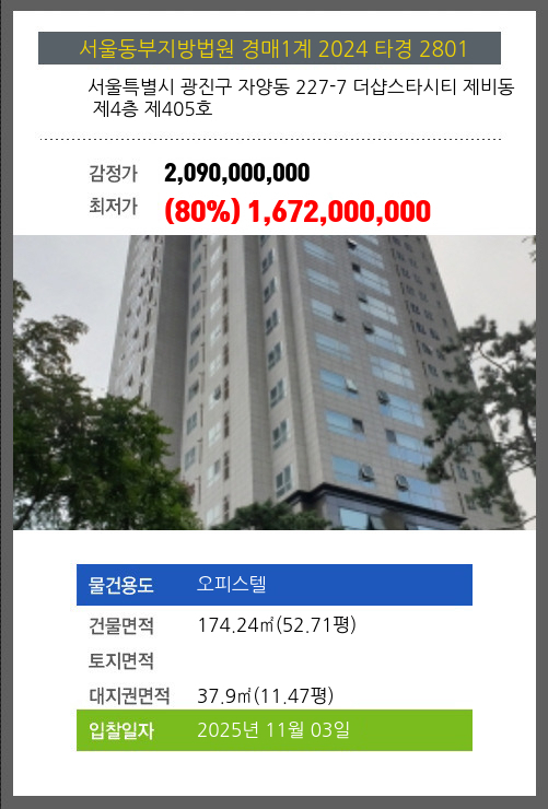 사건번호 2024 타경 2801 본건은 서울특별시 광진구 자양동 227-7 더샵스타시티 제비동 제4층 제405호소재하는 오피스텔경매 물건의 포스팅입니다. 건물면적 [ 174.24㎡ (52.71평) ]대지권 [ 37.9㎡ (11.47평) ]