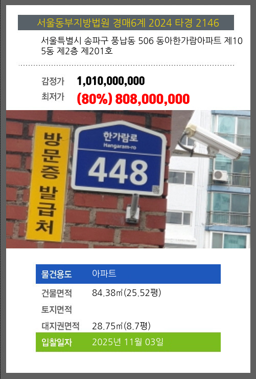 사건번호 2024 타경 2146 본건은 서울특별시 송파구 풍납동 506 동아한가람아파트 제105동 제2층 제201호소재하는 아파트경매 물건의 포스팅입니다. 건물면적 [ 84.38㎡ (25.52평) ]대지권 [ 28.75㎡ (8.7평) ]