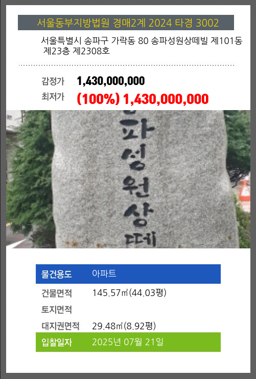 사건번호 2024 타경 3002 본건은 서울특별시 송파구 가락동 80 송파성원상떼빌 제101동 제23층 제2308호소재하는 아파트경매 물건의 포스팅입니다. 건물면적 [ 145.57㎡ (44.03평) ]대지권 [ 29.48㎡ (8.92평) ]