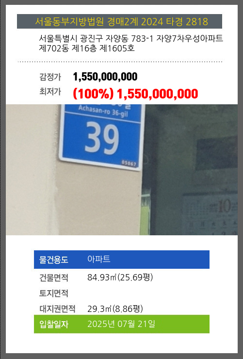 사건번호 2024 타경 2818 본건은 서울특별시 광진구 자양동 783-1 자양7차우성아파트 제702동 제16층 제1605호소재하는 아파트경매 물건의 포스팅입니다. 건물면적 [ 84.93㎡ (25.69평) ]대지권 [ 29.3㎡ (8.86평) ]