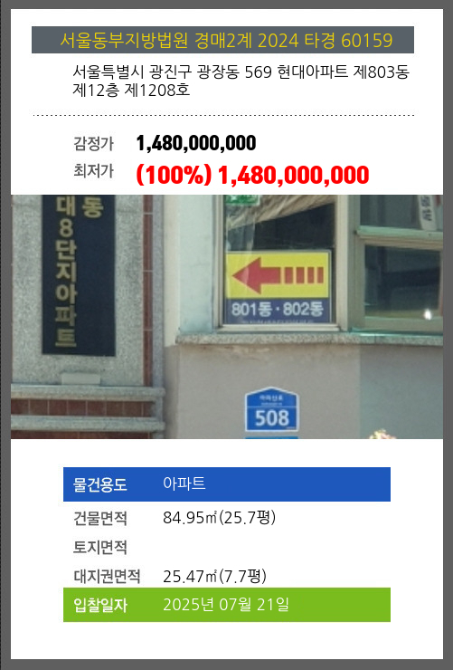 사건번호 2024 타경 60159 본건은 서울특별시 광진구 광장동 569 현대아파트 제803동 제12층 제1208호소재하는 아파트경매 물건의 포스팅입니다. 건물면적 [ 84.95㎡ (25.7평) ]대지권 [ 25.47㎡ (7.7평) ]