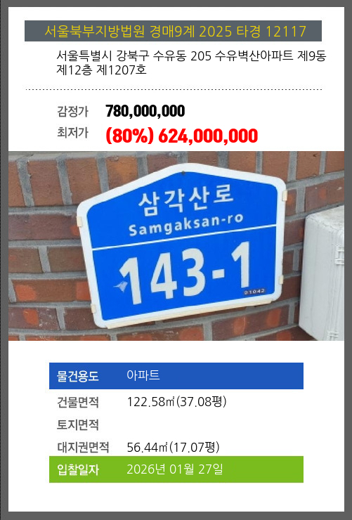 사건번호 2025 타경 12117 본건은 서울특별시 강북구 수유동 205 수유벽산아파트 제9동 제12층 제1207호소재하는 아파트경매 물건의 포스팅입니다. 건물면적 [ 122.58㎡ (37.08평) ]대지권 [ 56.44㎡ (17.07평) ]