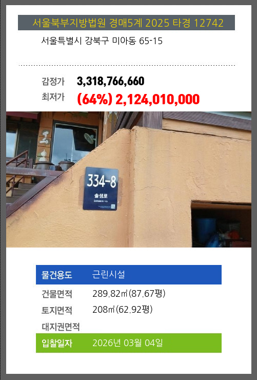 사건번호 2025 타경 12742 본건은 서울특별시 강북구 미아동 65-15소재하는 근린시설경매 물건의 포스팅입니다. 건물면적 [ 289.82㎡ (87.67평) ]토지면적 [ 208㎡ (62.92평) ] 시세를 반영한 감정가 3,318,766,660에서2회