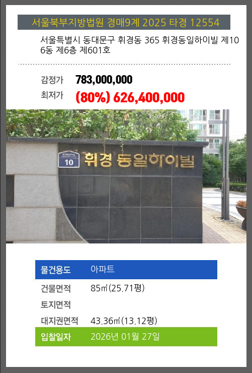사건번호 2025 타경 12554 본건은 서울특별시 동대문구 휘경동 365 휘경동일하이빌 제106동 제6층 제601호소재하는 아파트경매 물건의 포스팅입니다. 건물면적 [ 85㎡ (25.71평) ]대지권 [ 43.36㎡ (13.12평) ]