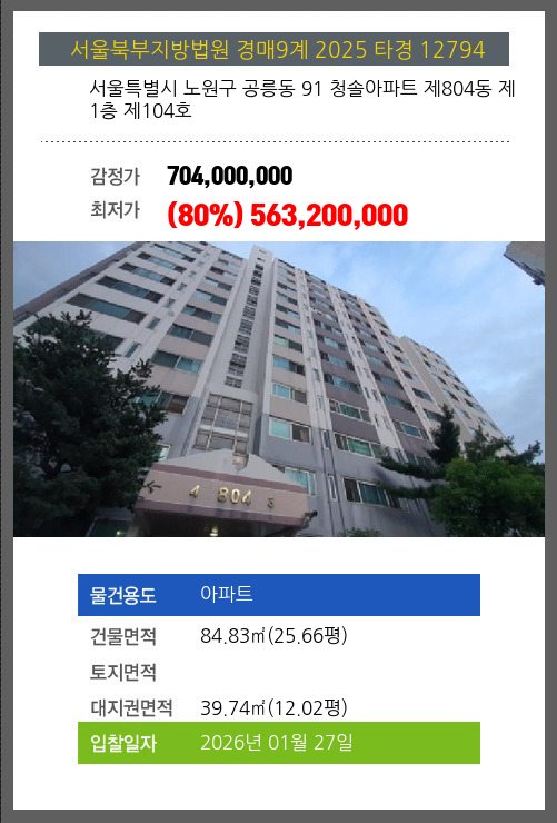 사건번호 2025 타경 12794 본건은 서울특별시 노원구 공릉동 91 청솔아파트 제804동 제1층 제104호소재하는 아파트경매 물건의 포스팅입니다. 건물면적 [ 84.83㎡ (25.66평) ]대지권 [ 39.74㎡ (12.02평) ]