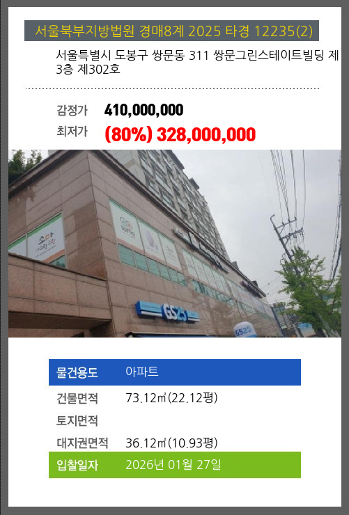 사건번호 2025 타경 12235(2) 본건은 서울특별시 도봉구 쌍문동 311 쌍문그린스테이트빌딩 제3층 제302호소재하는 아파트경매 물건의 포스팅입니다. 건물면적 [ 73.12㎡ (22.12평) ]대지권 [ 36.12㎡ (10.93평) ] 시세를