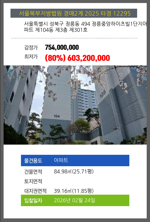 사건번호 2025 타경 12295 본건은 서울특별시 성북구 정릉동 494 정릉중앙하이츠빌1단지아파트 제104동 제3층 제301호소재하는 아파트경매 물건의 포스팅입니다. 건물면적 [ 84.98㎡ (25.71평) ]대지권 [ 39.16㎡ (11.85평) ]