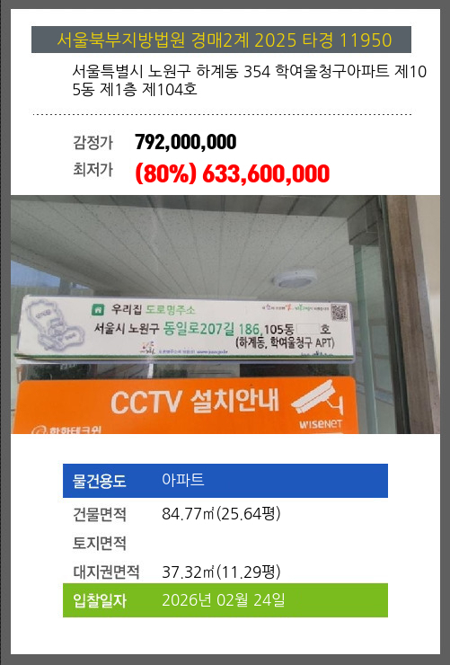사건번호 2025 타경 11950 본건은 서울특별시 노원구 하계동 354 학여울청구아파트 제105동 제1층 제104호소재하는 아파트경매 물건의 포스팅입니다. 건물면적 [ 84.77㎡ (25.64평) ]대지권 [ 37.32㎡ (11.29평) ]