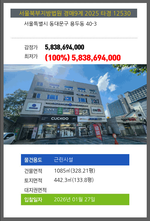 사건번호 2025 타경 12530 본건은 서울특별시 동대문구 용두동 40-3소재하는 근린시설경매 물건의 포스팅입니다. 건물면적 [ 1085㎡ (328.21평) ]토지면적 [ 442.3㎡ (133.8평) ] 시세를 반영한 감정가 5,838,694,000에서신건으로
