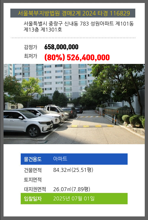 사건번호 2024 타경 116829 본건은 서울특별시 중랑구 신내동 783 성원아파트 제101동 제13층 제1301호소재하는 아파트경매 물건의 포스팅입니다. 건물면적 [ 84.32㎡ (25.51평) ]대지권 [ 26.07㎡ (7.89평) ]
