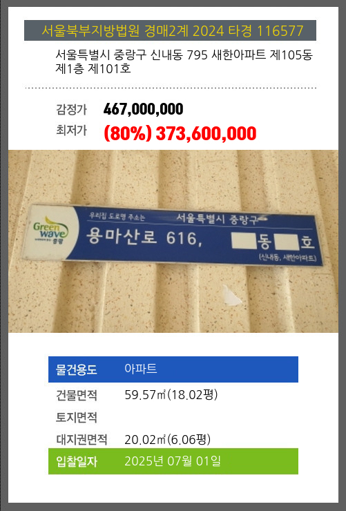 사건번호 2024 타경 116577 본건은 서울특별시 중랑구 신내동 795 새한아파트 제105동 제1층 제101호소재하는 아파트경매 물건의 포스팅입니다. 건물면적 [ 59.57㎡ (18.02평) ]대지권 [ 20.02㎡ (6.06평) ]